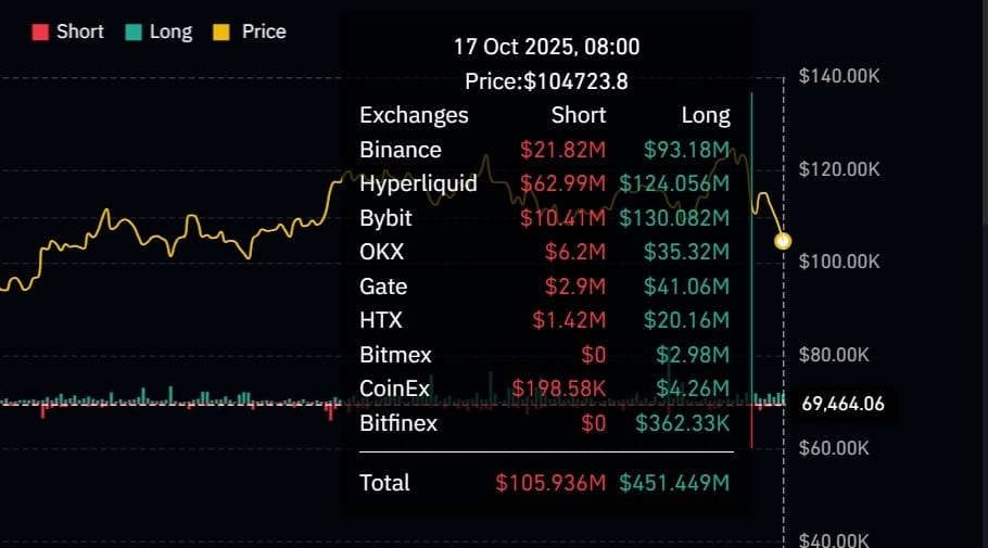 Из этой суммы примерно $451 миллион составили длинные позиции, а $105 миллионов — короткие ликвидации.