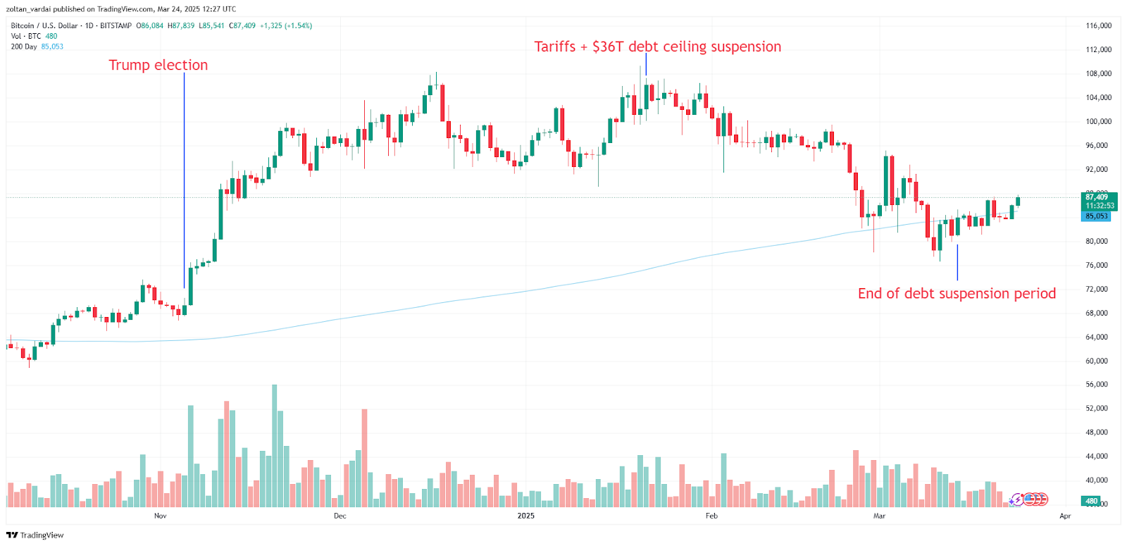 «Я ожидаю, что произойдет с тарифами после 2 апреля. Возможно, некоторые из них будут сняты, но это зависит от того, смогут ли все страны договориться. Это сейчас самый большой фактор влияния», — сказал аналитик во время ежедневного шоу Chainreaction от dc.finance 21 марта.