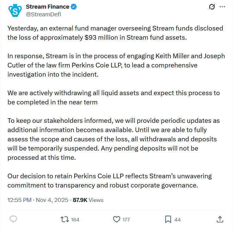 Платформа децентрализованных финансов Stream Finance заявила, что приостановила операции ввода и вывода средств после того, как внешний управляющий фондами обнаружил убыток в размере $93 млн в активах.