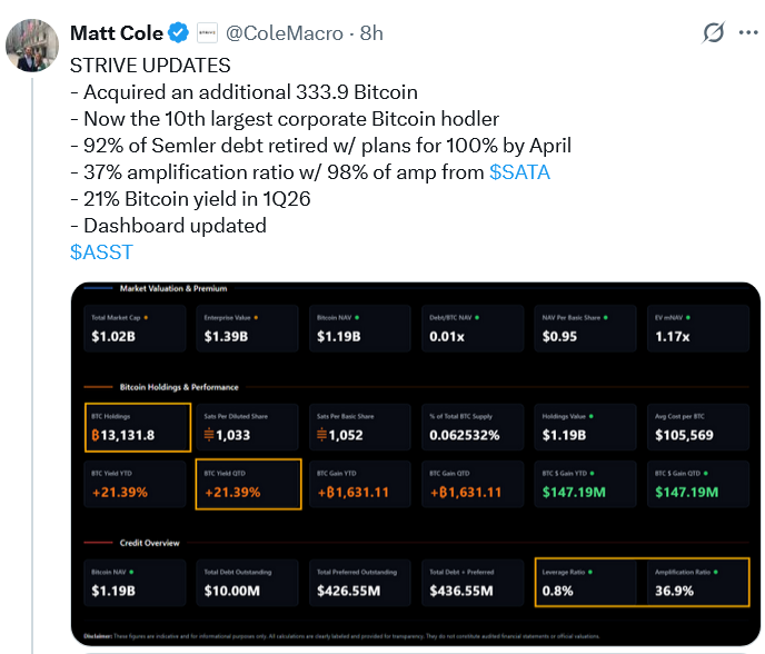 После покупки 333,9 BTC по средней цене $89 851 общий объем резервов Strive вырос до 13 132 BTC, что оценивается примерно в $1,17 млрд, и вывел компанию в десятку крупнейших корпоративных держателей Bitcoin.