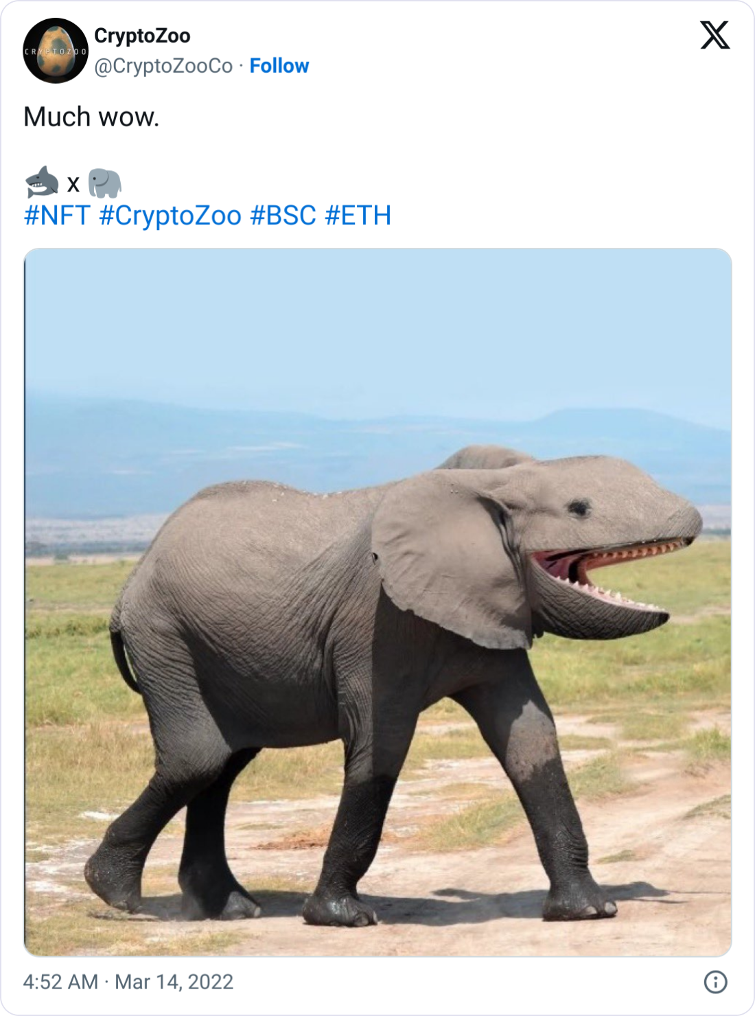 Пример животного NFT из CryptoZoo, представляющего собой комбинацию акулы и слона. Источник: CryptoZoo