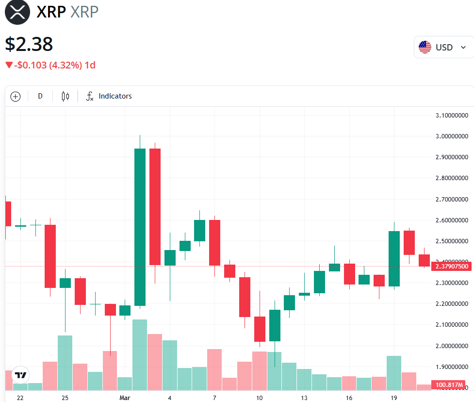Несмотря на ралли в 11% после объявления 19 марта, токен XRP (XRP) не смог удержаться выше ключевой психологической отметки в 2,5 доллара. По данным dc.finance Markets Pro, токен упал более чем на 6,3% с 19 марта.