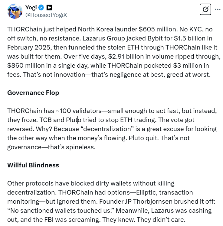 «THORChain просто помог Северной Корее отмыть 605 миллионов долларов. Ни KYC, ни возможности остановки, ни сопротивления. Группа Лазарус ограбила Bybit на 1,5 миллиарда долларов в феврале 2025 года и провела украденный эфир через THORChain, как будто он был создан для них», — написал популярный криптокомментатор Йоги в посте от 4 марта на X.