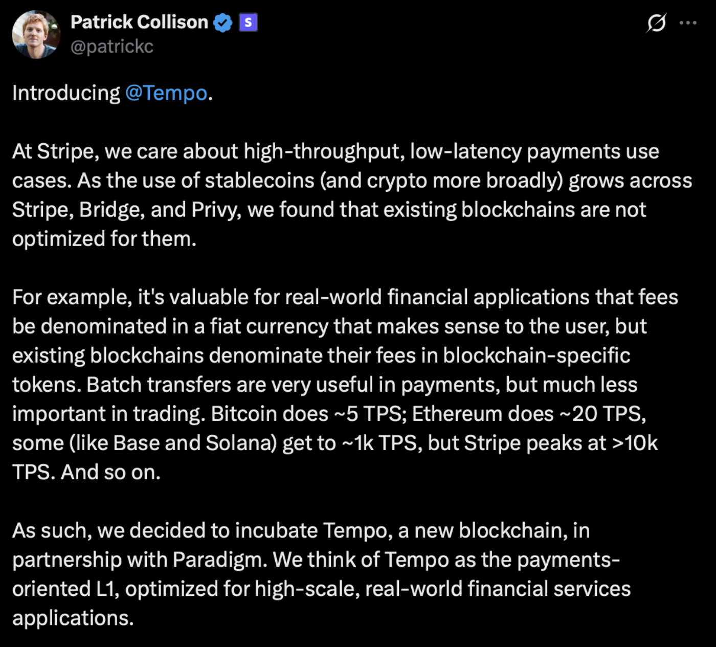 4 сентября генеральный директор Stripe Патрик Коллисон написал в X: «По мере того как использование стабильных монет (и криптовалют в целом) растет среди Stripe, Bridge и Privy, мы обнаружили, что существующие блокчейны не оптимизированы для них.»