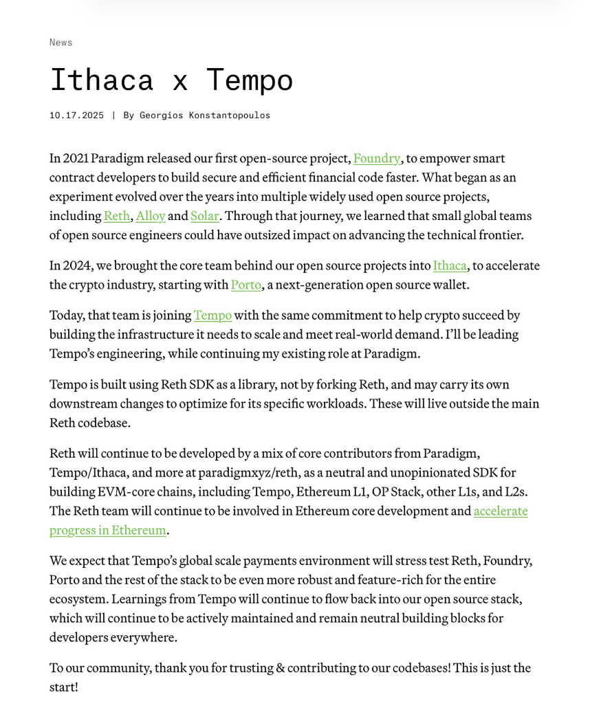 Хотя дата запуска Темпо не была объявлена, технический директор Paradigm Георгиос Константопулос заявил в пятницу, что основная команда, стоящая за их проектами с открытым исходным кодом в Ithaca, присоединилась к Темпо для помощи в создании инфраструктуры платежей блокчейна и увеличения его инженерных усилий.
