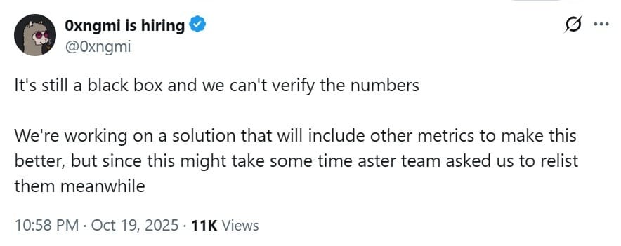 Ответив на сообщение, 0xngmi заявил, что команда все еще не может подтвердить данные, описав это как «черный ящик». Он добавил, что, хотя DefiLlama разрабатывает новую систему для включения дополнительных метрик, команда Aster попросила о временном возврате в листинг.