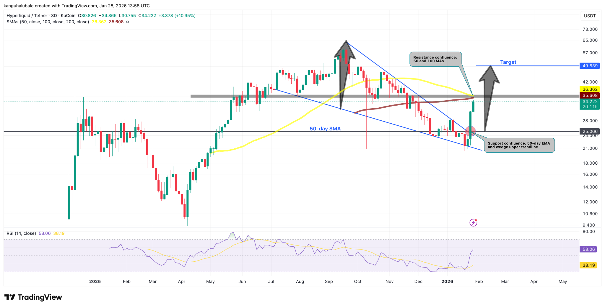 При реализации цели по фигуре цена HYPE может подняться примерно к $49,8, что соответствует около 45% роста от текущих уровней.