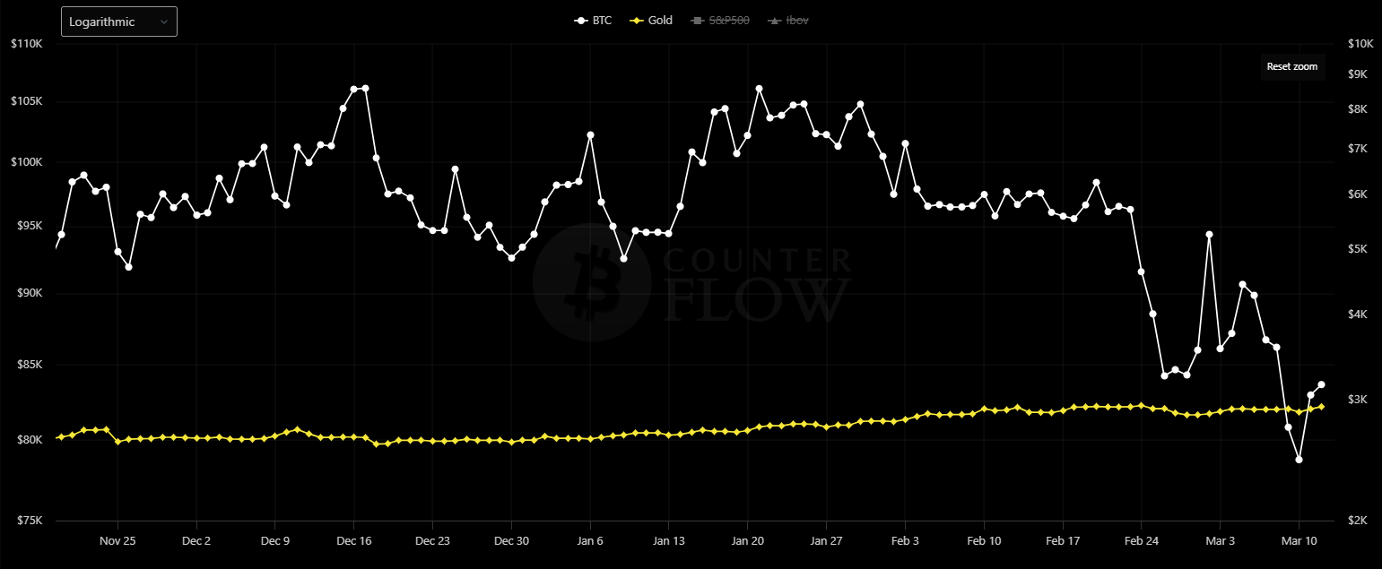 График цен на Биткоин (белый) и золото (жёлтый) с 1 декабря по 13 марта. Источник: Bitcoin Counter Flow
