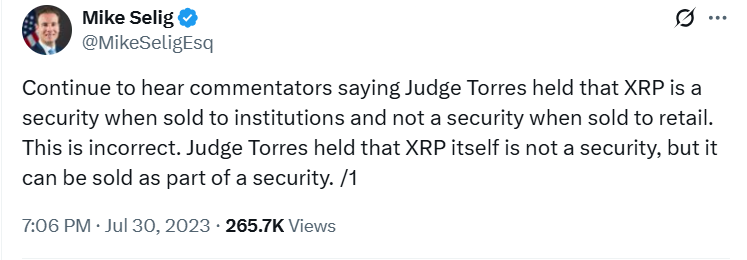 Наблюдатели отметили глубокий анализ Селига в деле SEC против Ripple. В 2023 году он утверждал, что XRP “это просто компьютерный код.” Он назвал его “взаимозаменяемым товаром, как золото или виски, — оба из которых также могут продаваться в рамках инвестиционных схем, которые подпадают под законодательство о ценных бумагах.”