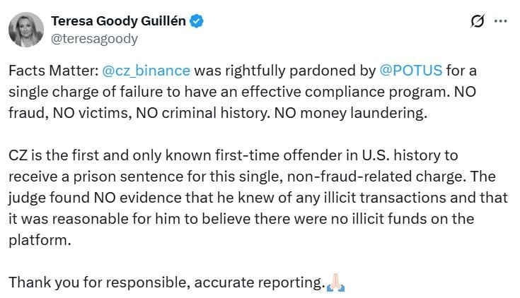 Адвокат по криптовалютам Чжао, Тереза Гуди Гильен, в четверг сказала, что помилование было правильным решением, поскольку у её клиента было "только одно обвинение в отсутствии эффективной программы комплаенса. Никакого мошенничества, никаких жертв, никакой криминальной истории. Никакого отмывания денег".
