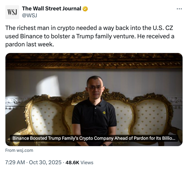 Когда ведущий CBS Нора О'Доннелл задала вопрос о сообщениях, что Binance содействовала покупке стейблкоинов на сумму 2 миллиарда долларов, связанной с поддерживаемой Трампом World Liberty Financial (WLFI) перед помилованием, Трамп отверг подобные предположения.