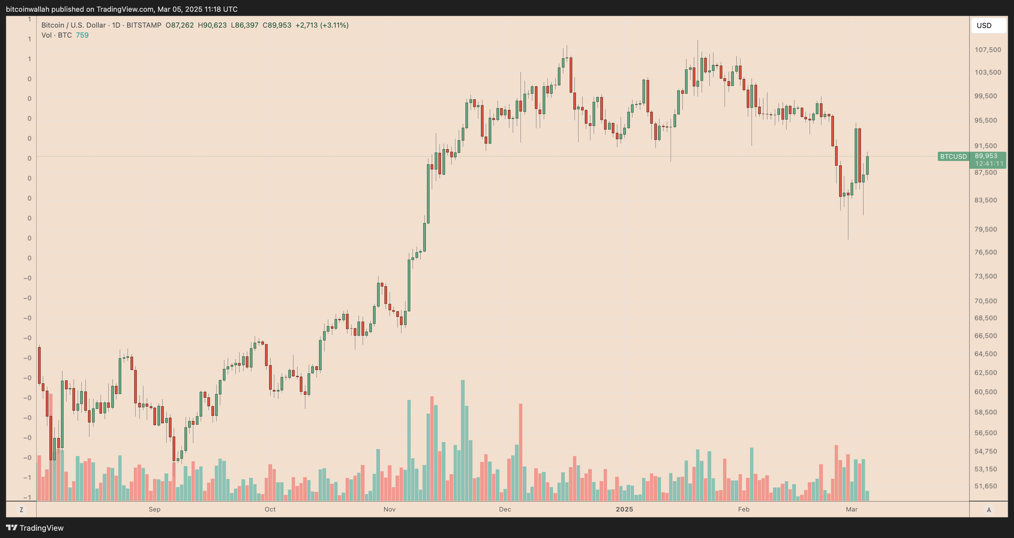 Биткоин (BTC) упал более чем на 15% с 3 февраля, когда президент США Дональд Трамп пригрозил ввести тарифы на Китай, Мексику и Канаду, и торговался на уровне около 86 400 долларов к 5 марта.