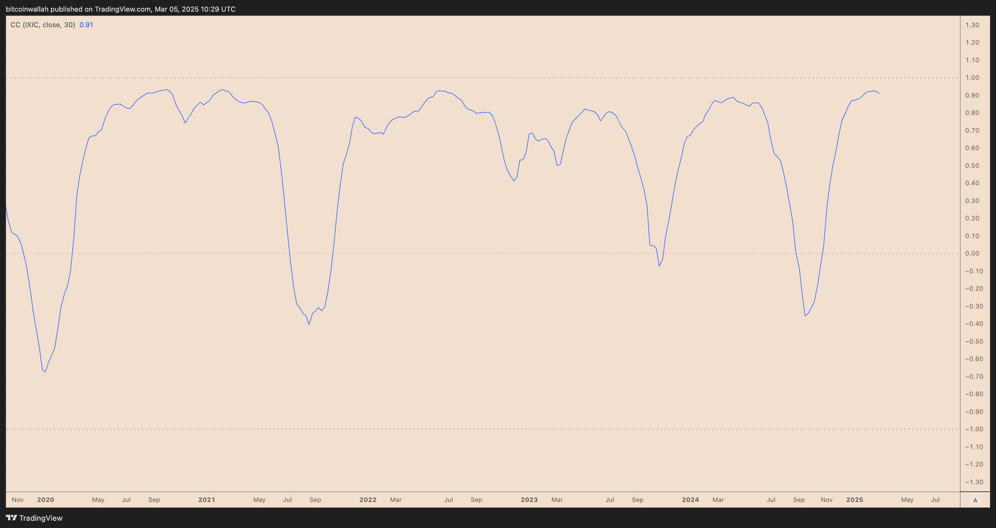 Коэффициент корреляции за 30 недель BTC/USD и Nasdaq Composite. Источник: TradingView