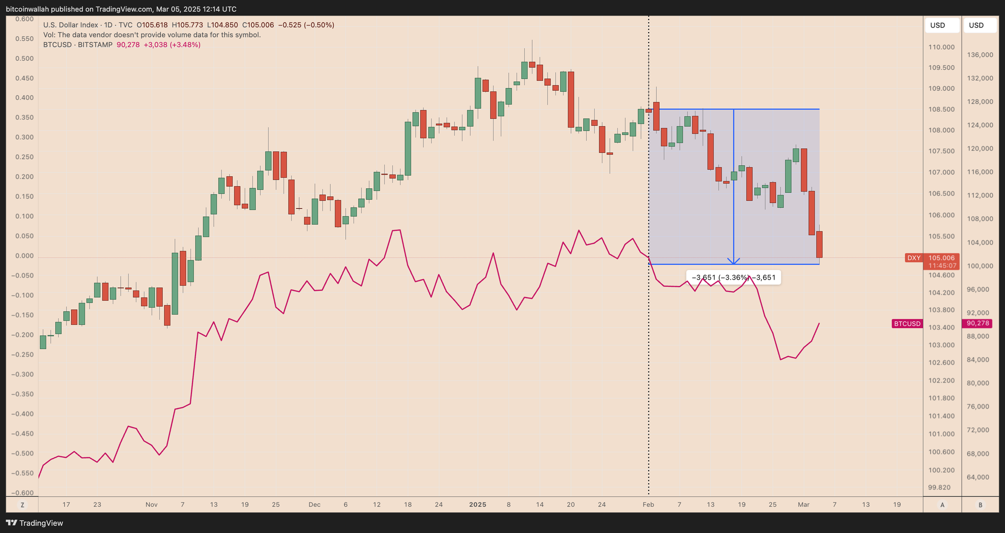 Однако в этот раз DXY достиг пика на фоне объявления о тарифах Трампа и с тех пор снижается, как и биткоин, что противоречит обычным оптимистичным предположениям.