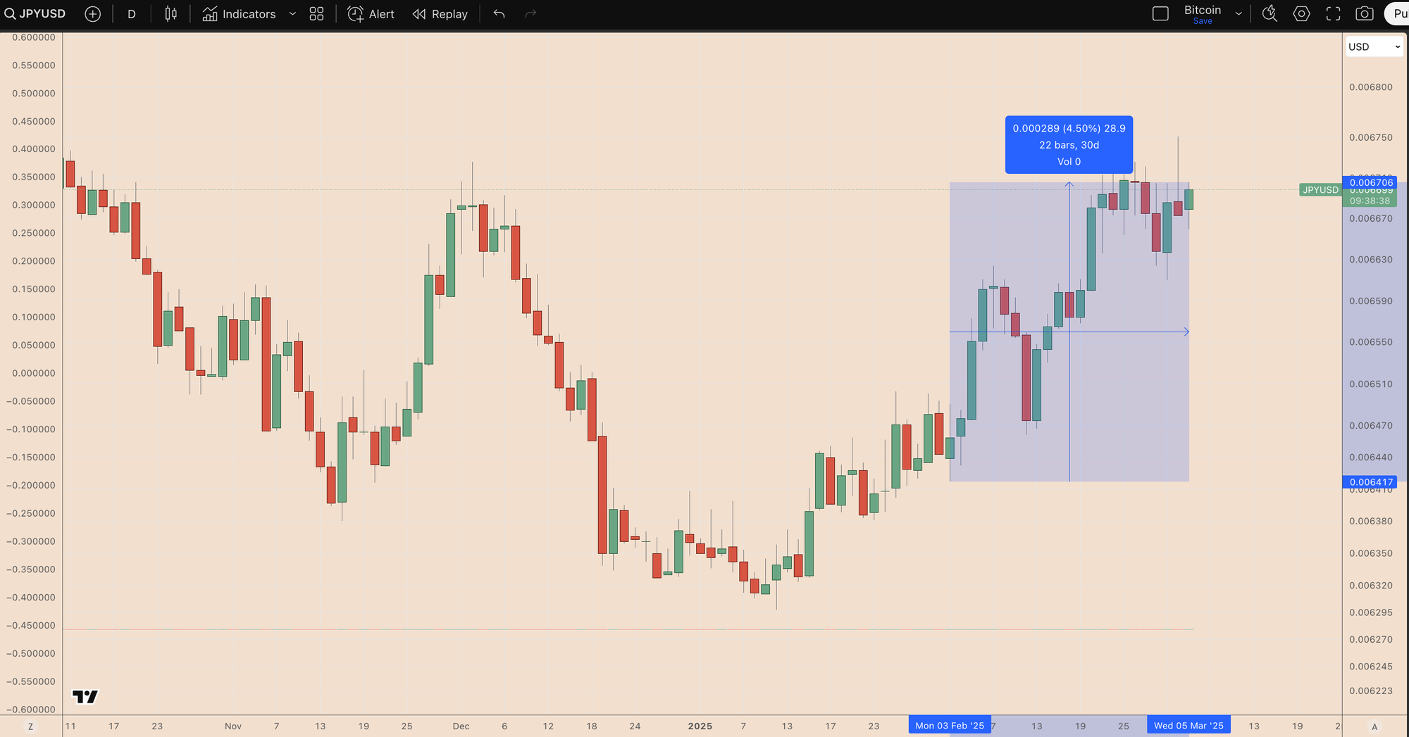 Японская иена (JPY), еще одно воспринимаемое безопасное убежище, поднялась на 4,5% с момента объявления Трампа 3 февраля.