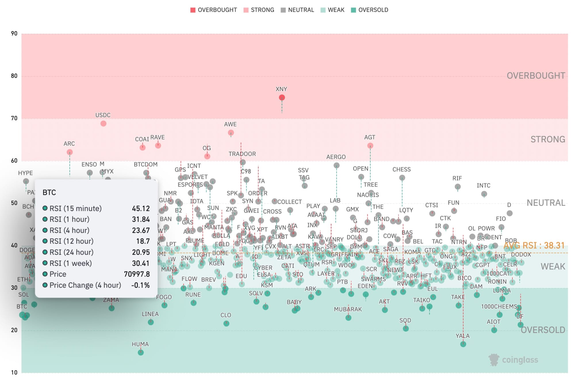 По данным тепловой карты CoinGlass, RSI по BTC показывает перепроданность на пяти из шести таймфреймов.