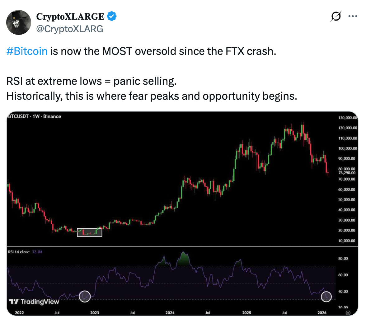 Аналитик CryptoXLARGE в X написал, что биткоин сейчас наиболее перепродан со времен краха FTX, что отражает панические продажи, и что исторически именно в такие моменты страх достигает пика, а возможности начинают появляться.