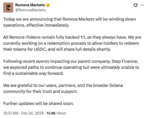Step Finance также работает над выкупом токенов STEP у держателей на основе снимка состояния до инцидента. Для владельцев rToken в Remora Markets, по словам команды, будет предусмотрена процедура погашения.