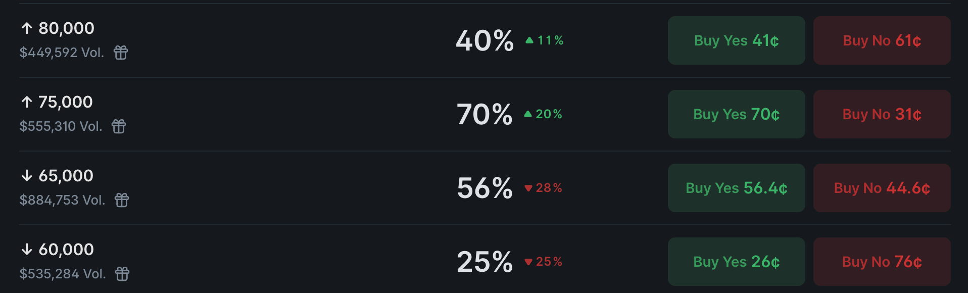 Сейчас участники оценивают вероятность достижения $80 000 в 40% (против 20% днем ранее). Для уровня $75 000 вероятность поднялась до 70% (против 40% накануне).
