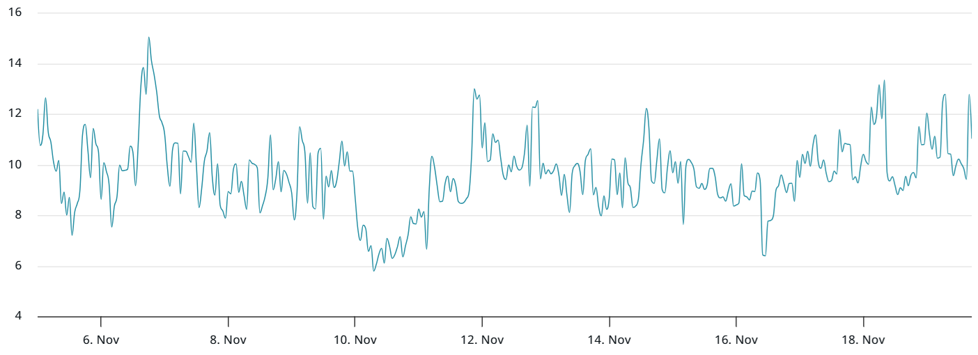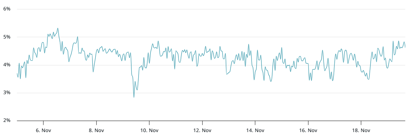 Ставка финансирования бессрочных фьючерсов BTC находилась на уровне около 4% в среду, что соответствует среднему показателю за последние две недели. Хотя этот уровень все еще отражает медвежью позицию, признаков паники или чрезмерной уверенности со стороны медведей нет. Слабость кажется отражением прошлого, поскольку Bitcoin движется вниз с тех пор, как достиг своего исторического максимума 6 октября.