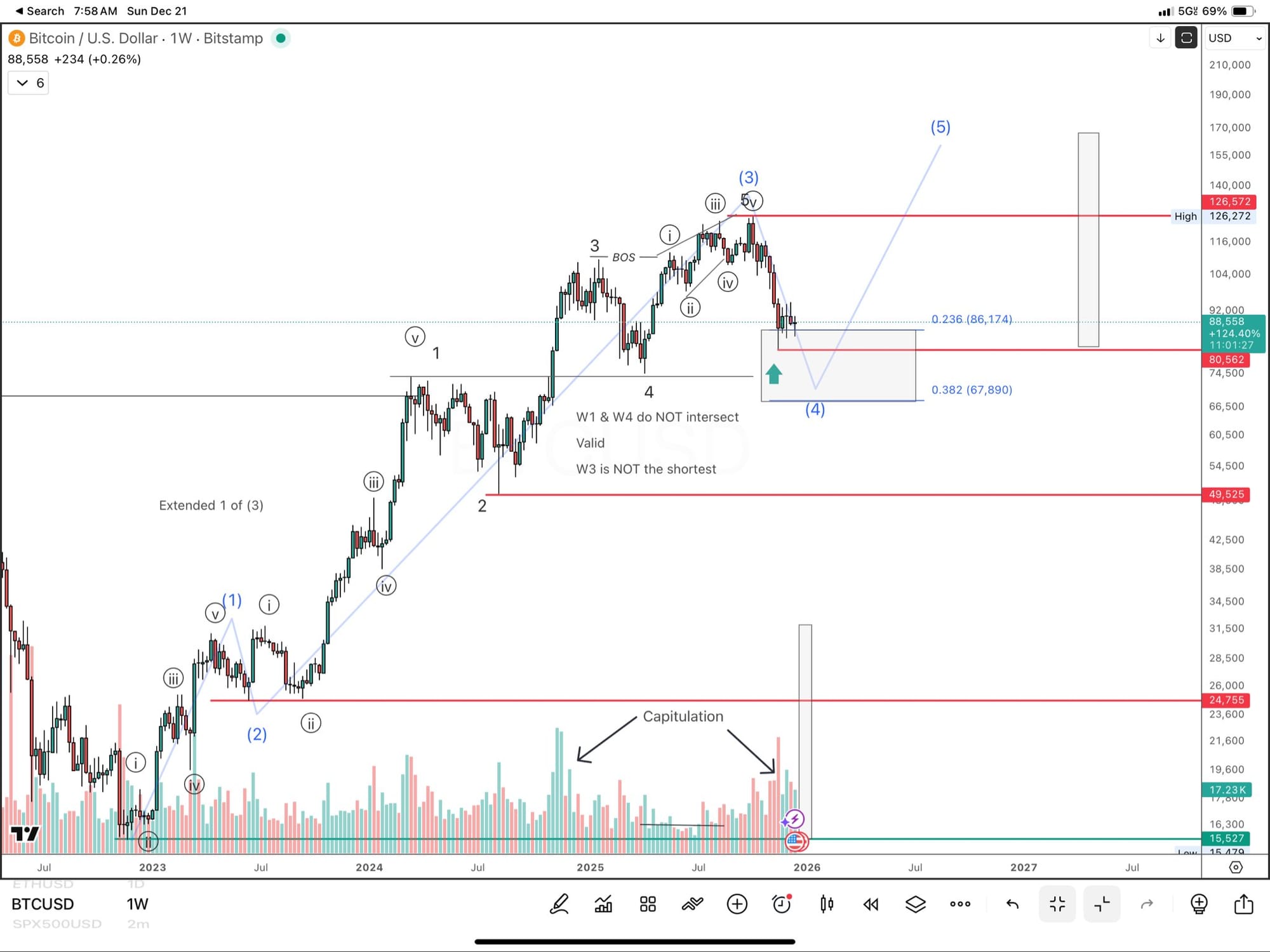 «Мы должны увидеть еще один более высокий максимум для синей W5 до ATH, завершающей структуру из 5 волн», говорится в сообщении X, используя теорию волн Эллиота для построения следующего движения биткоина.