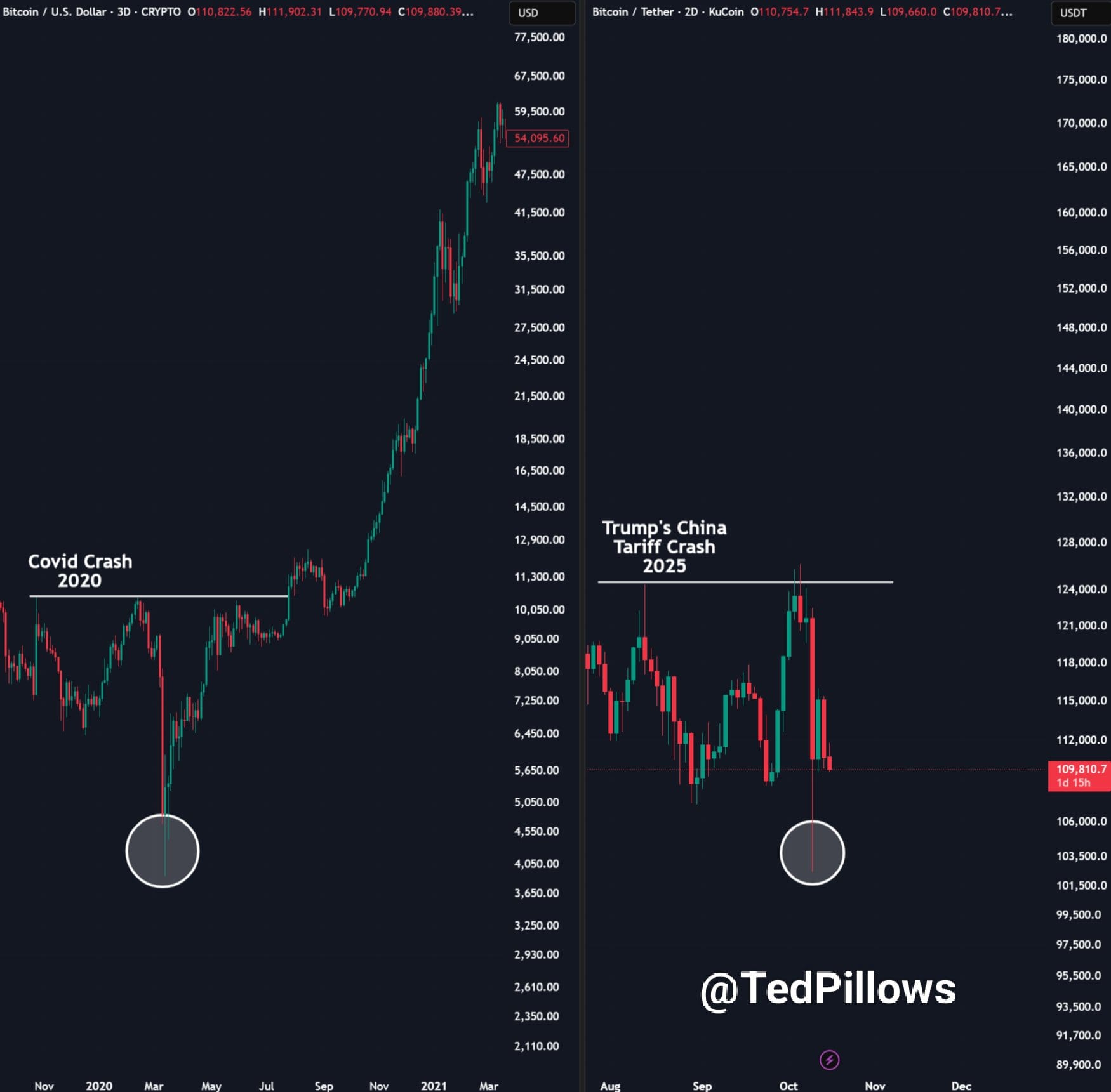 Пиллоус загрузил график, сравнивающий текущие движения цены BTC с падением на кросс-рынке COVID-19 в марте 2020 года.
