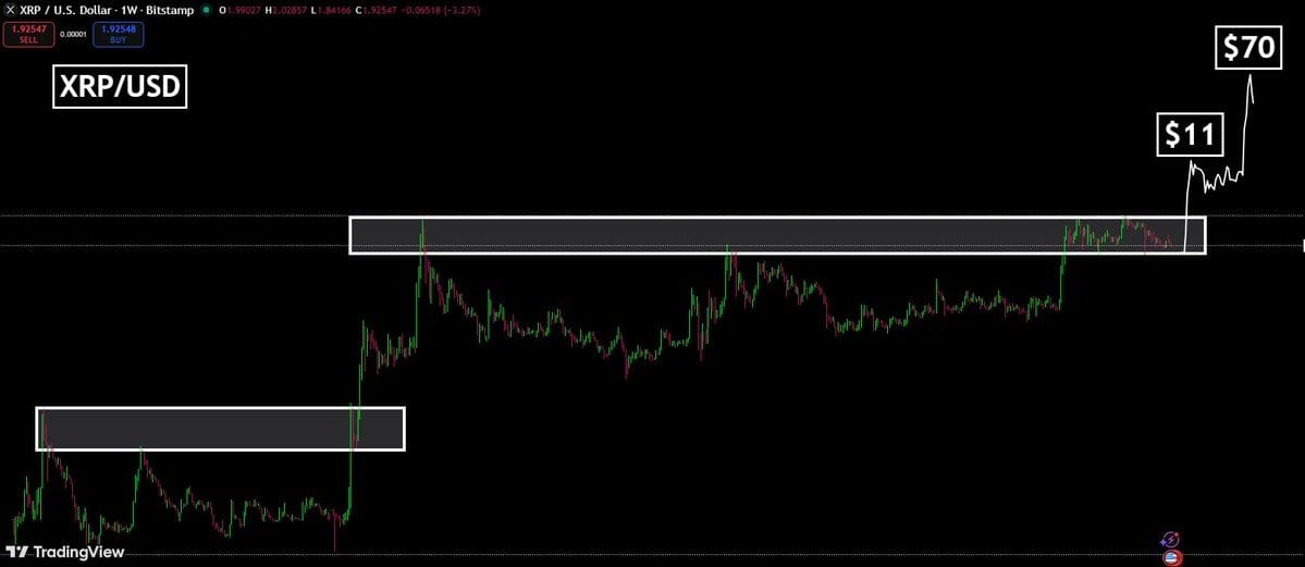 Если аналогичный сценарий повторится, XRP может надолго застрять около $2 (максимумы 2021 года) перед сильным прорывом. CryptoBull также допустил, что «следующий импульс» способен поднять цену к $11, а финальная волна — к $70.