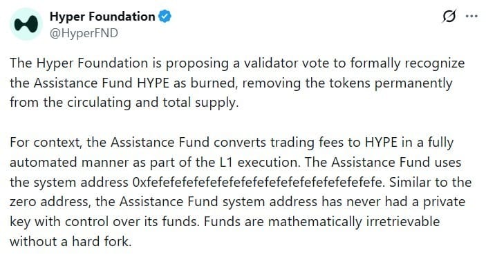 Фонд Hyper Foundation предложил провести голосование среди валидаторов для официального признания токенов HYPE, хранящихся на адресе системы Фонда помощи протокола Hyperliquid, как навсегда недоступных, исключив их из обращения и общего предложения актива.
