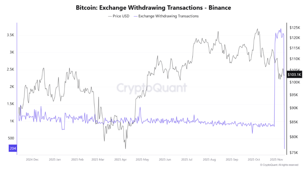 “В начале ноября на Binance был зафиксирован внезапный всплеск транзакций по выводу биткоина — один из крупнейших скачков в 2025 году,” написал исследователь XWIN Research Japan на платформе CryptoQuant в одном из их постов Quicktake.