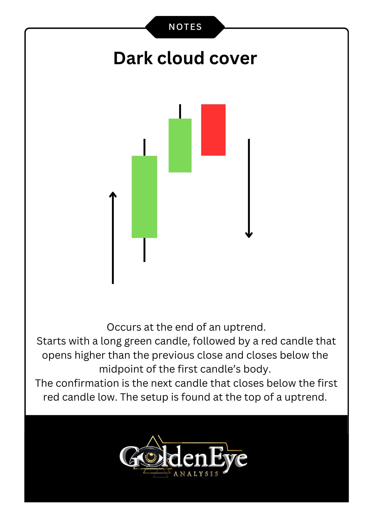 Паттерн темного облака образуется, когда сильная зеленая свеча следует за красной свечой, которая открывается выше предыдущего закрытия, но закрывается ниже середины тела первой свечи.