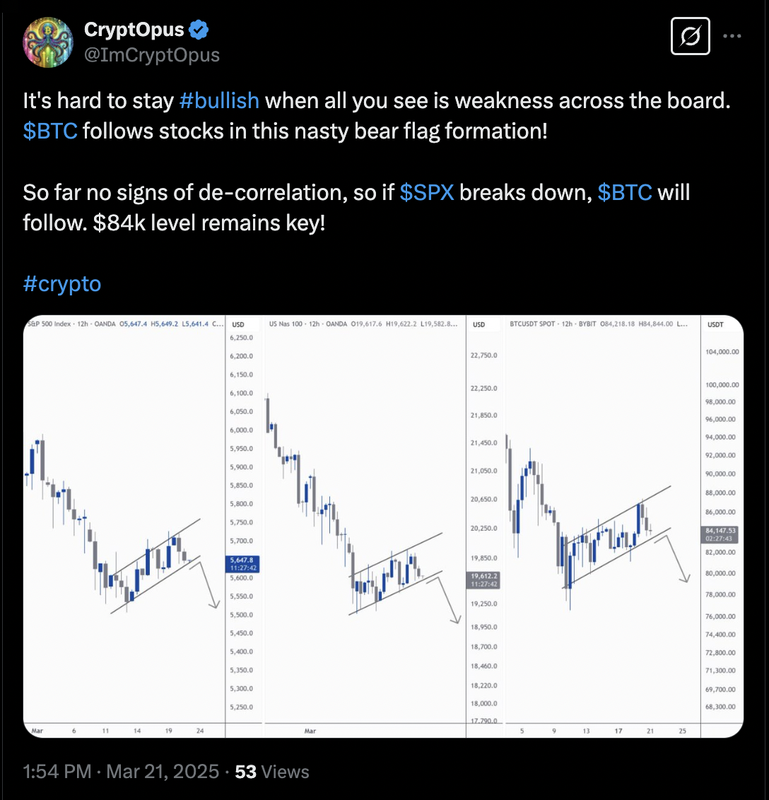 По словам аналитика CryptOpus, биткойн остается тесно связан с традиционными фондовыми рынками, особенно с S&P 500 (SPX) и Nasdaq 100 (NDX), которые демонстрируют на графиках паттерны медвежьего флага.