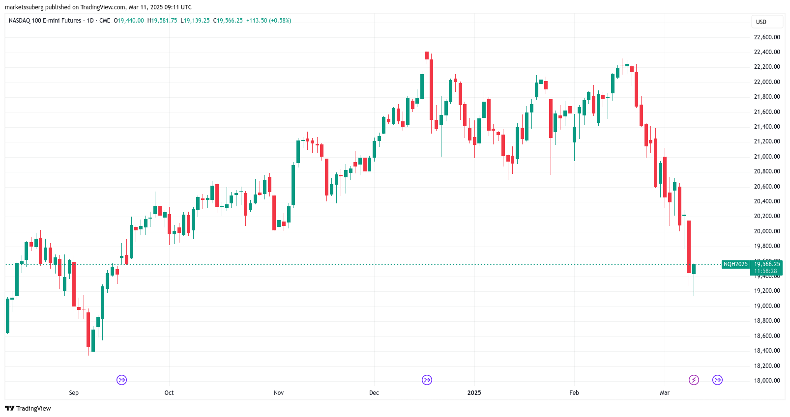 S&P 500 и Nasdaq Composite Index завершили день снижением на 2,7% и 4% соответственно. На момент написания статьи фьючерсы на Nasdaq 100 восстановились примерно на 0,4% от своих минимумов с сентября 2024 года.
