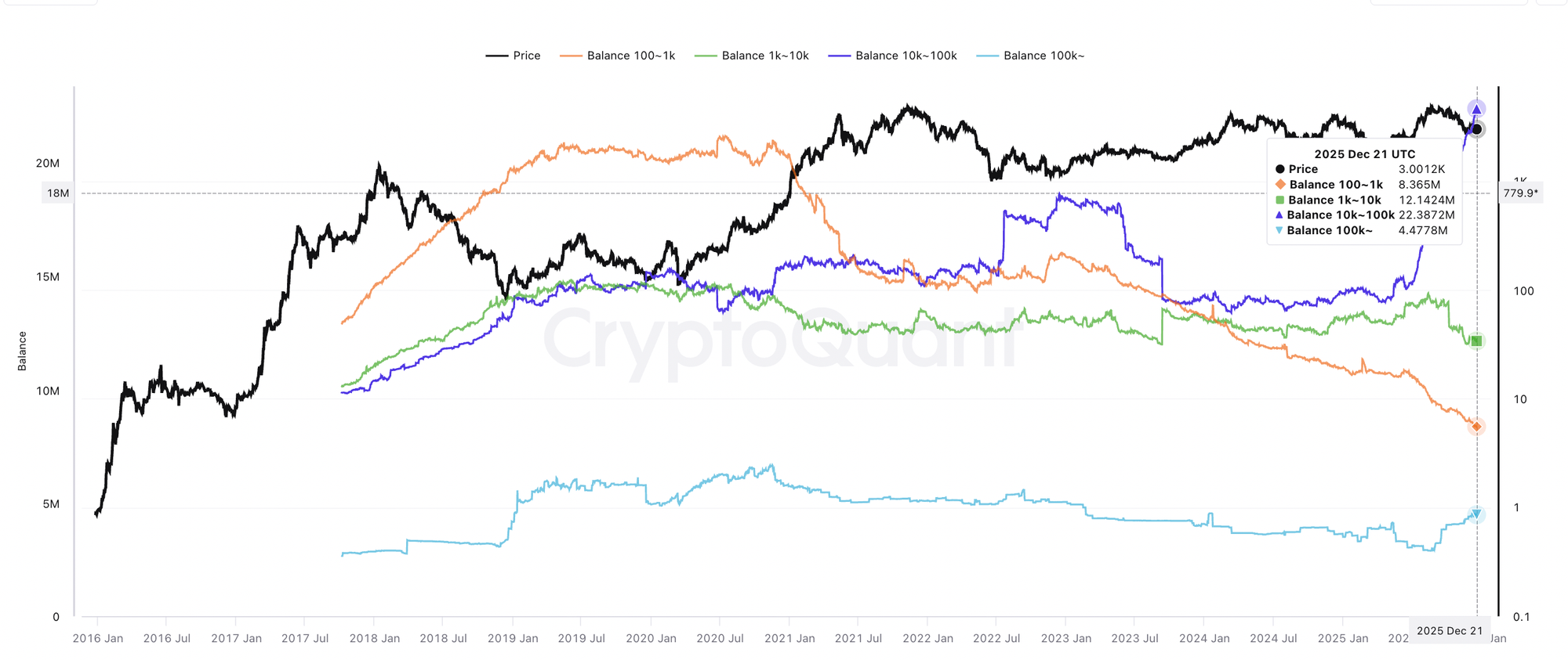 Одновременно розничные и средние инвесторы выступают чистыми продавцами, и их запасы снижаются с 2024 года. Это указывает на перераспределение, а не на спекулятивные притоки в эти кошельки.