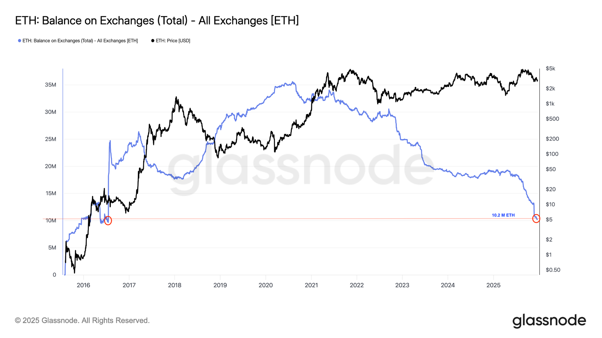Запасы ETH на биржах снизились на 45% до девятилетнего минимума в 10.2 миллиона ETH в воскресенье с 18.5 миллиона ETH 1 июля.