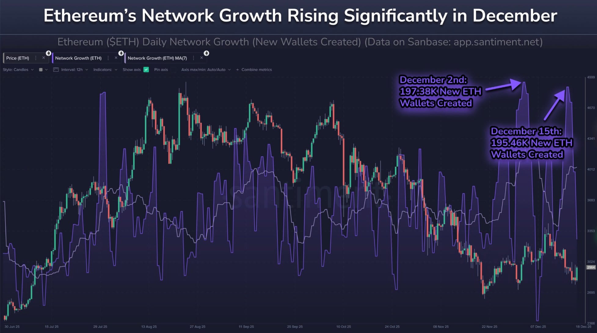 Дополнительные данные Santiment показывают всплеск создания новых кошельков на сети Ethereum, с средним числом 163,000 новых адресов в день в декабре, по сравнению с 124,000 в июле.