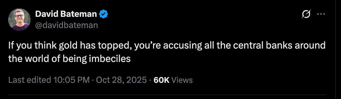 Трейдер металлов Дэвид Бейтман утверждает, что бычий рынок золота остается фундаментально прочным, несмотря на текущую коррекцию.