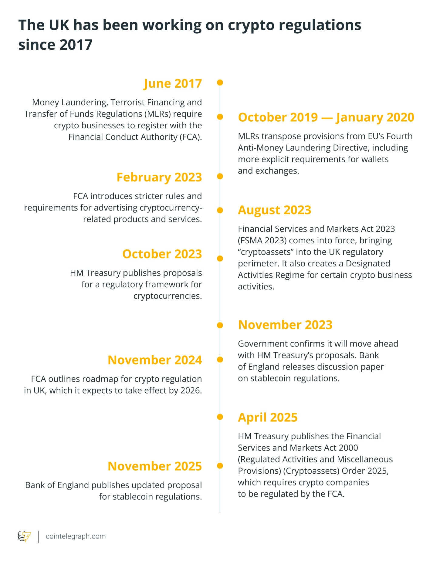 Британское правительство работает над криптовалютными регулировками с 2017 года, когда оно впервые приняло требования по борьбе с отмыванием денег и идентификации клиентов для криптосвязанных компаний, таких как биржи. Теперь, спустя восемь лет, центральный банк всё ещё разрабатывает свою политику на основе обратной связи с индустрией.