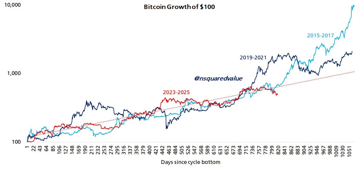 Помимо графика, показывающего доходность $100 в BTC, он также отметил, что слабая производительность на бычьем рынке всегда была временной.