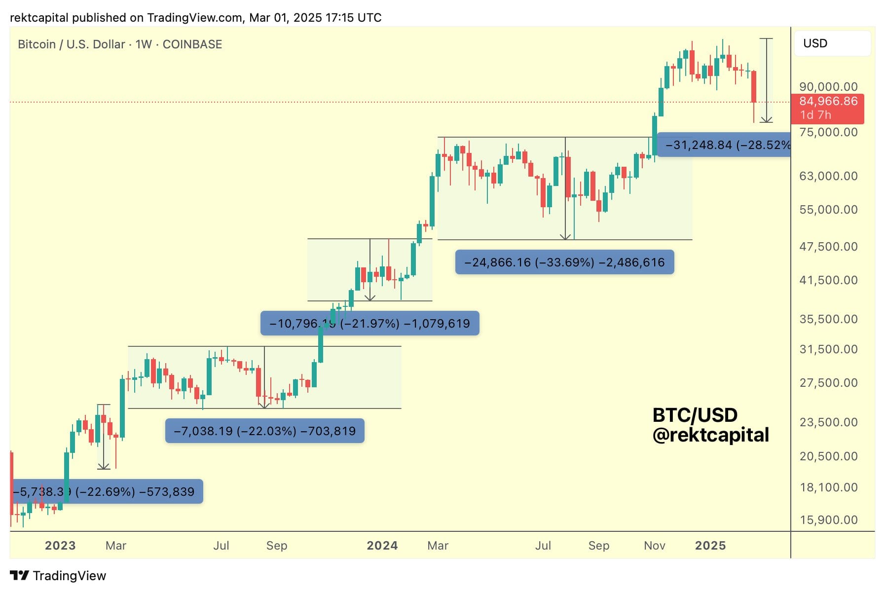 «Не нужно смотреть на предыдущие бычьи ралли BTC, чтобы понять, что корректировки являются частью цикла», — популярный трейдер и аналитик Rekt Capital написал в анализе этого феномена в начале марта.