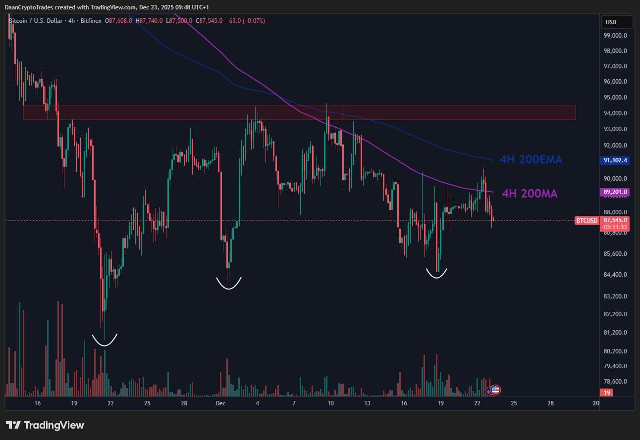 Трейдер Daan Crypto Trades отметил в своем последнем анализе на X: “$BTC продолжает сталкиваться с сопротивлением от своей 4H 200MA/EMA тенденции.”