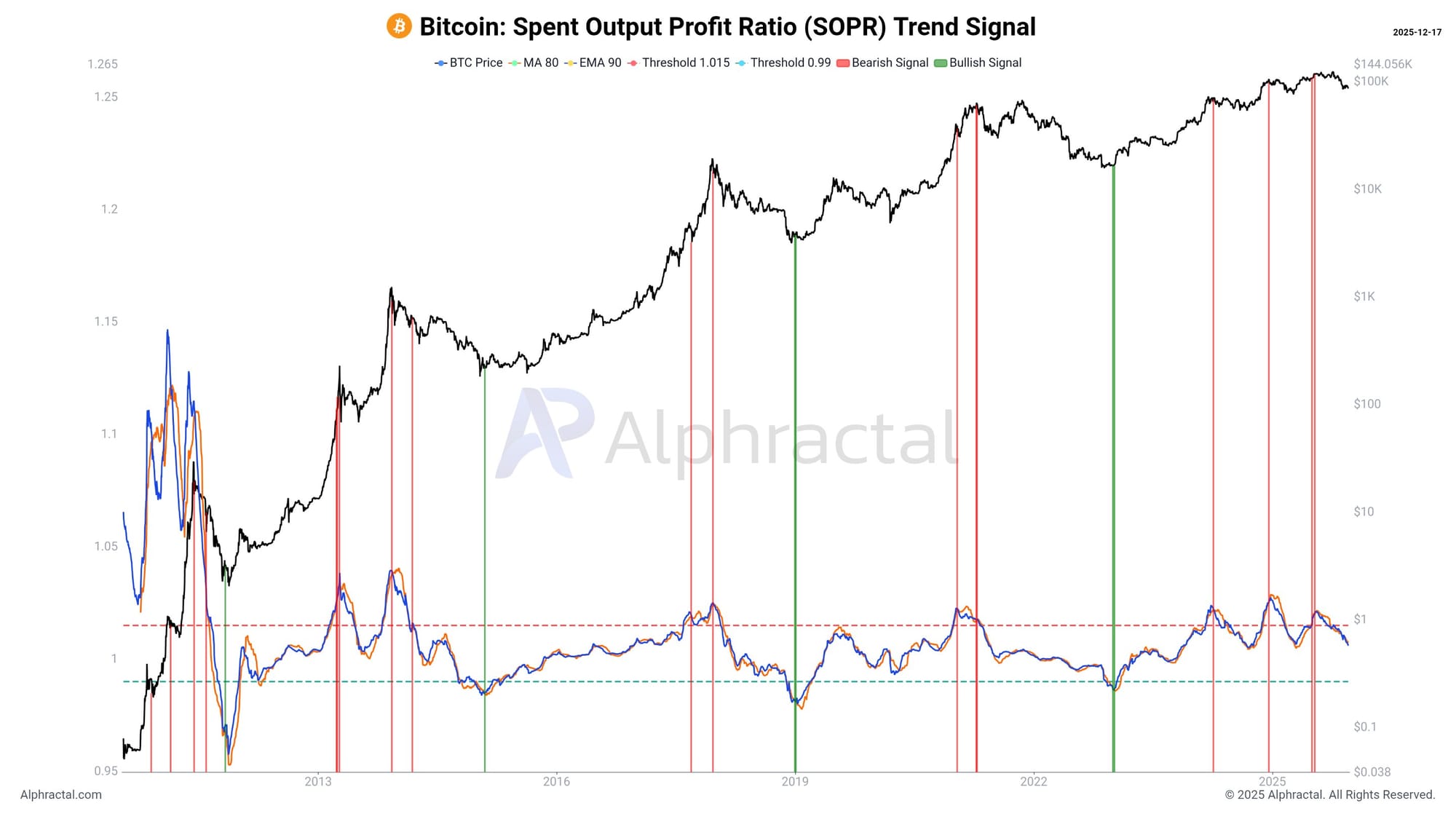 Жуан Ведсон, основатель компании Alphractal, занимающейся ончейн-аналитикой, отметил на тренд по коэффициенту прибыли от затрат (SOPR), который сигнализирует о конце бычьего рынка биткоина.
