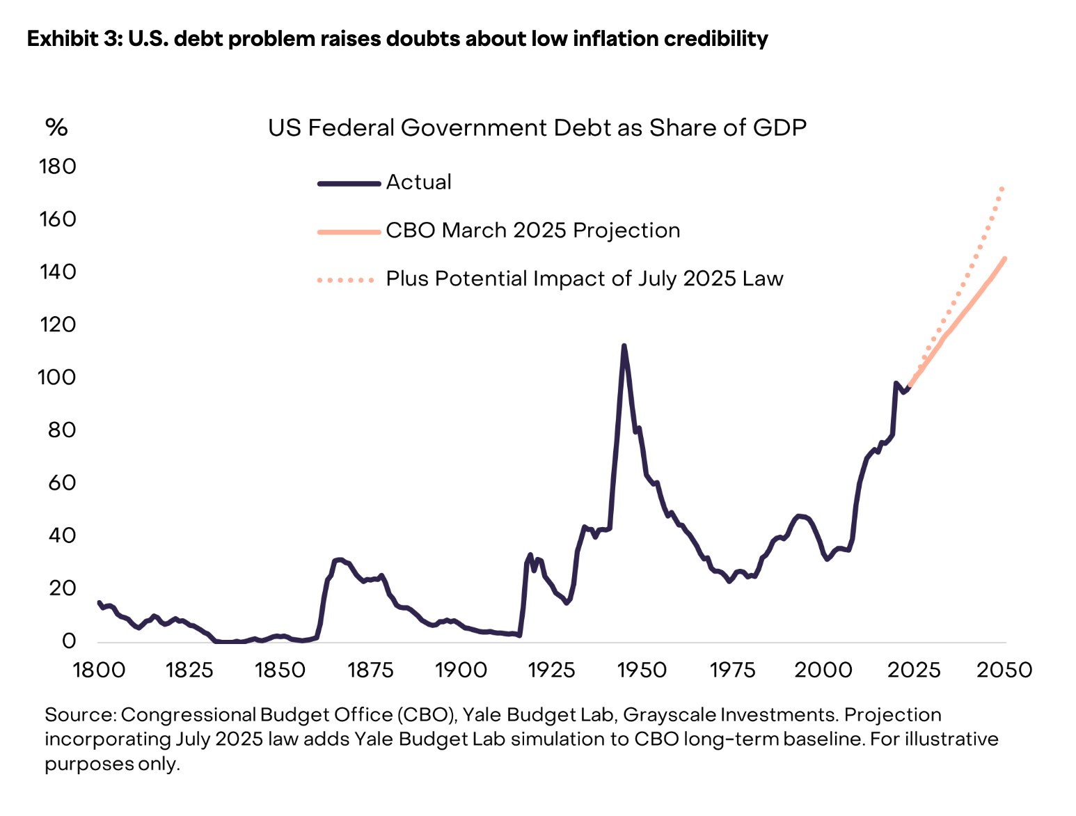 «Фиатные валюты и активы, номинированные в фиатных валютах, сталкиваются с дополнительными рисками из-за высокого и растущего государственного долга и его потенциальных последствий для инфляции со временем», — написано в последнем отчете Grayscale, добавляя: