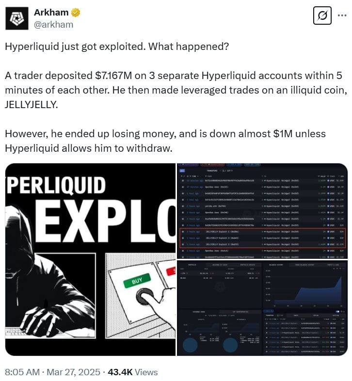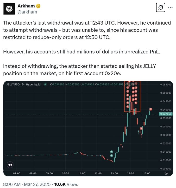 Компания по аналитике блокчейнов Arkham Intelligence сообщила 26 марта на X, что трейдер пытался манипулировать системой для извлечения прибыли из изменения цен, выводя обеспеченные средства до того, как система ликвидации Hyperliquid успевала реагировать.