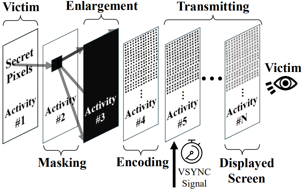 Задача не так проста, как запрос и доступ к контенту отображения другого приложения. Вместо этого создается стек из полупрозрачных элементов, контролируемых атакующим, чтобы скрыть все, кроме выбранного пикселя, и затем манипулировать этим пикселем так, чтобы его цвет доминировал в кадре.
