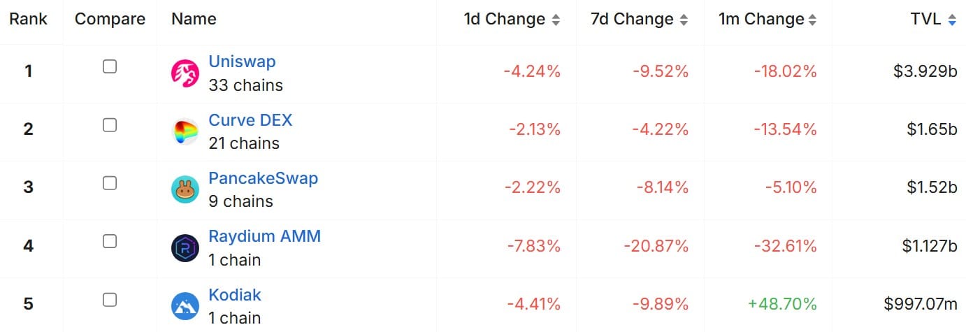 TVL Uniswap лидирует, несмотря на трудности в отрасли. Источник: DefiLlama