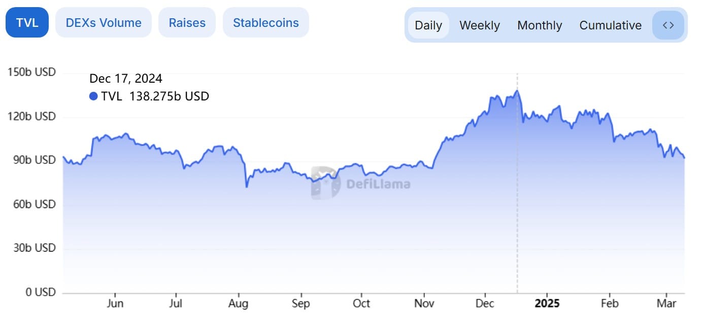 Общая заблокированная стоимость в отрасли снизилась со $138 млрд в середине декабря 2024 года до $91,8 млрд на 10 марта, согласно DefiLlama.