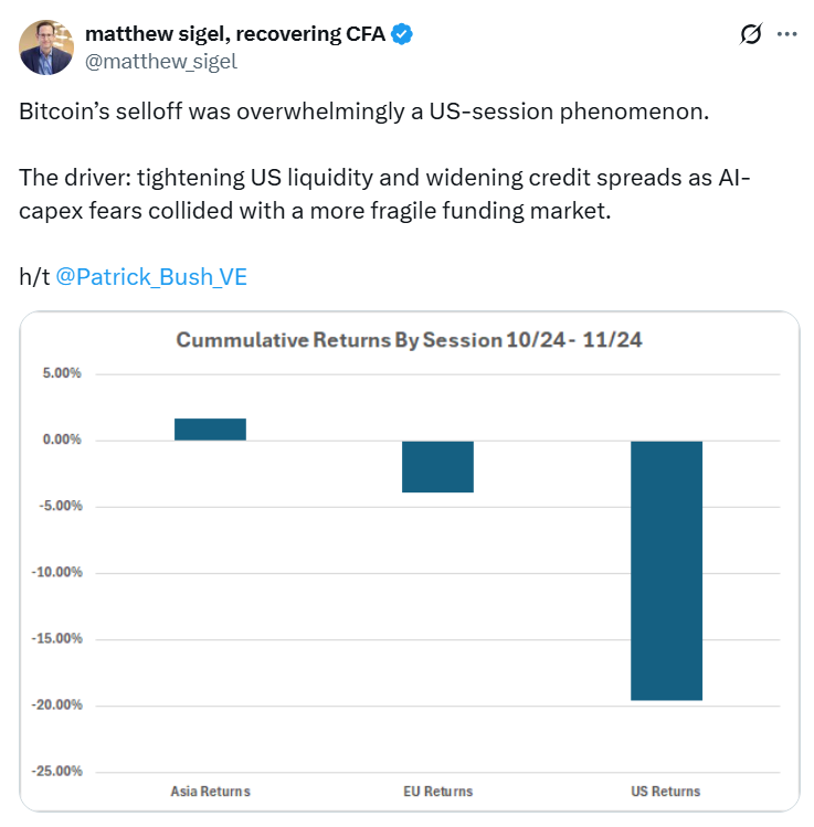 Мэтью Сигел, руководитель отдела цифровых активов в инвестиционной компании VanEck, заявил в понедельник, что недавняя распродажа Биткоина, в результате которой токен упал до минимумов около $82 000, была «преимущественно явлением американской сессии».