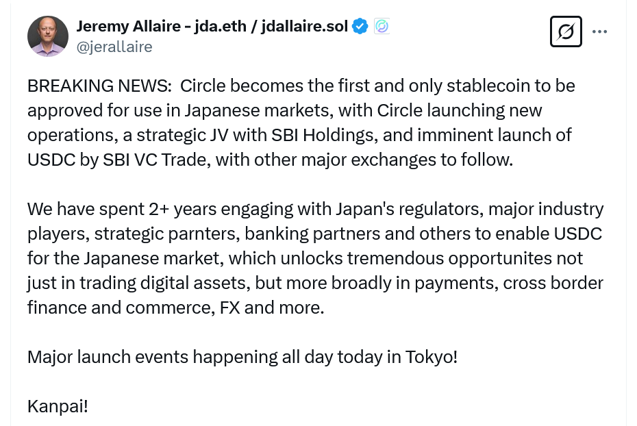 Эта новость способствует тому, что SBI VC Trade получила первое в отрасли регуляторное одобрение 4 марта на листинг USDC в соответствии с регулятивными рамками Японского агентства финансовых услуг для стейблкоинов.