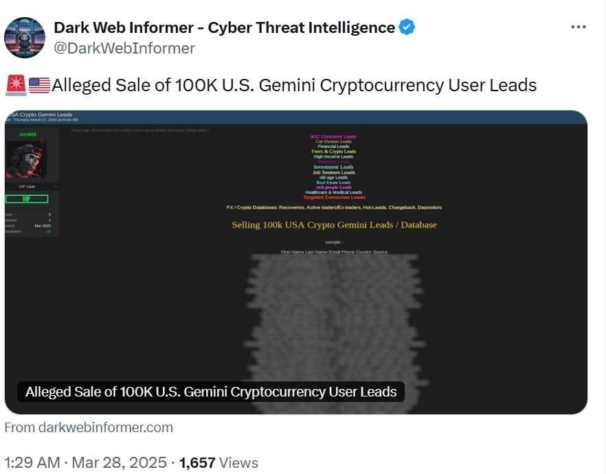 Сайт киберновостей Dark Web Informer написал в блоге 27 марта, что последняя продажа осуществляется злоумышленником под ником AKM69, который якобы имеет обширный список личной информации пользователей криптобиржи Gemini.