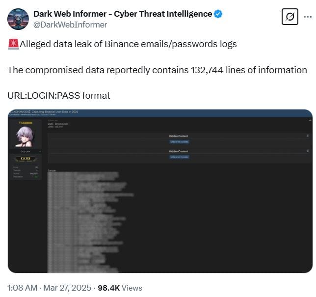 Днем ранее Dark Web Informer сообщил, что другой пользователь, kiki88888, предлагал на продажу электронные почты и пароли Binance, и якобы скомпрометированные данные содержали 132 744 строки информации.